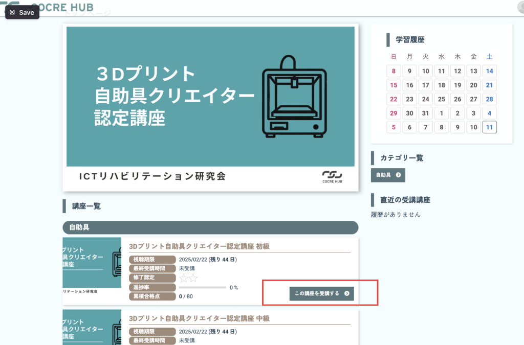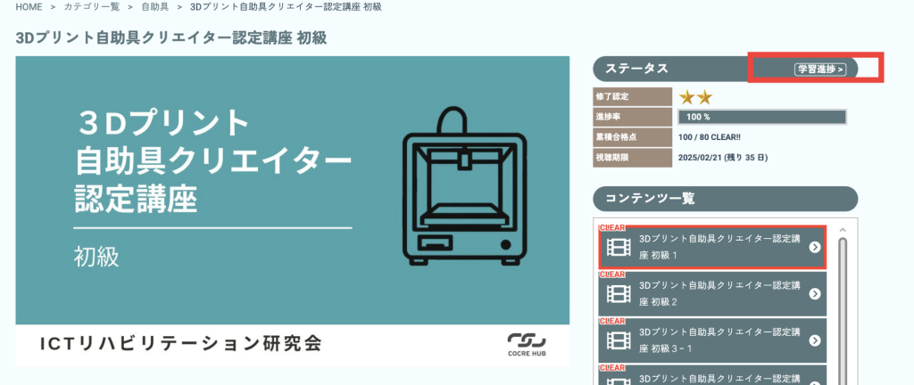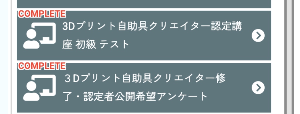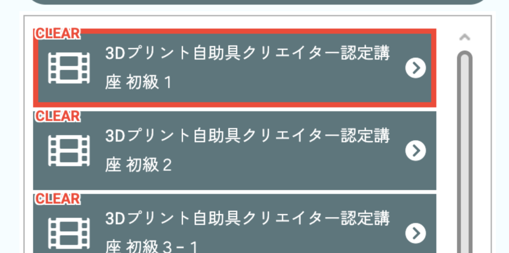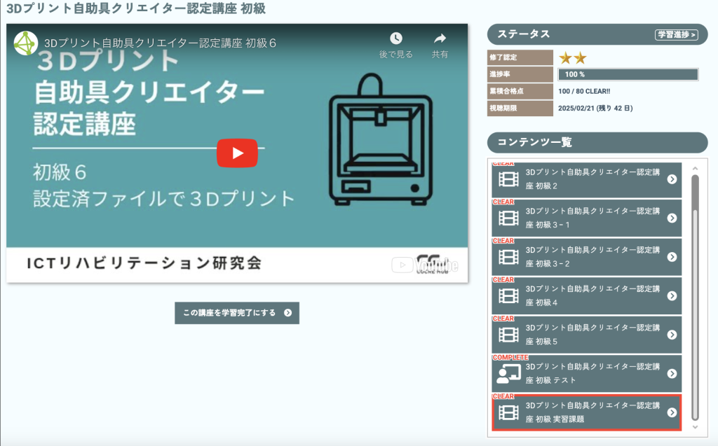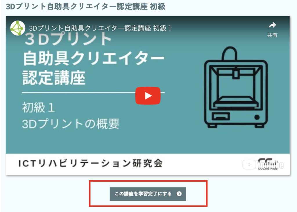 本講座は、3Dプリンタを用いて自助具を作成できるための基礎知識を得るとともに、技術を習得するための講座です。講座は座学とテスト、実習に分かれており、実習では実際に3Dプリントしていただいた制作物を、事務局に送っていただくことで一定水準の技術がある個人であると評価・認定をさせていただく講座です。講座はLMS(Learning Management System)で構成されており、基本的には直感的な操作でご受講いただくことができます。下記手順をご一読いただくことで一層わかりやすく操作いただけると思いますので、是非目を通してみてください。