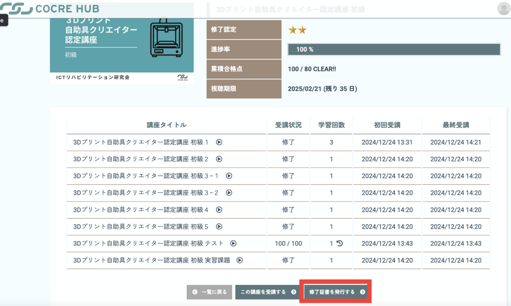 それぞれの講座の「ステータス」>「学習進捗」から、下へスクロールして「修了証を発行する」をクリックしてください。