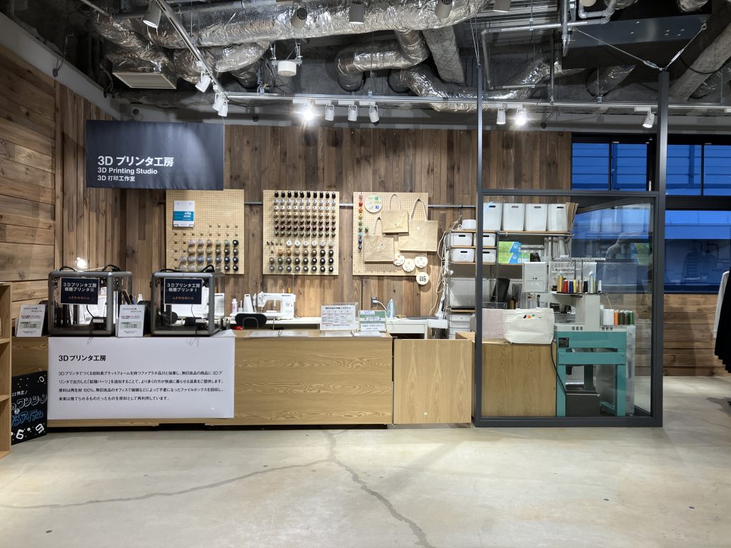 同店 3F には刺繍工房と併せて 3D プリンタ工房が設置されており、無印良品のプロダクトを拡張できる道具をその場で 3D プリントして販売しています。